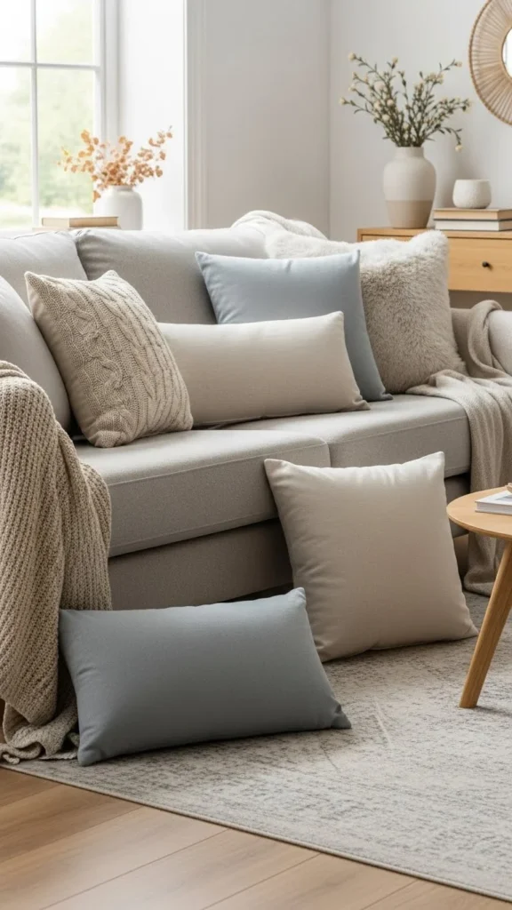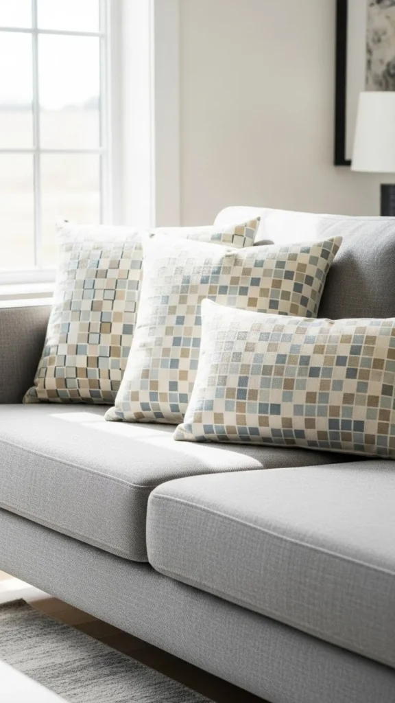 One striped pillow can balance several solid ones. Keep stripe colors close to your sofa tone for a calm look.