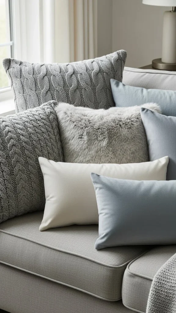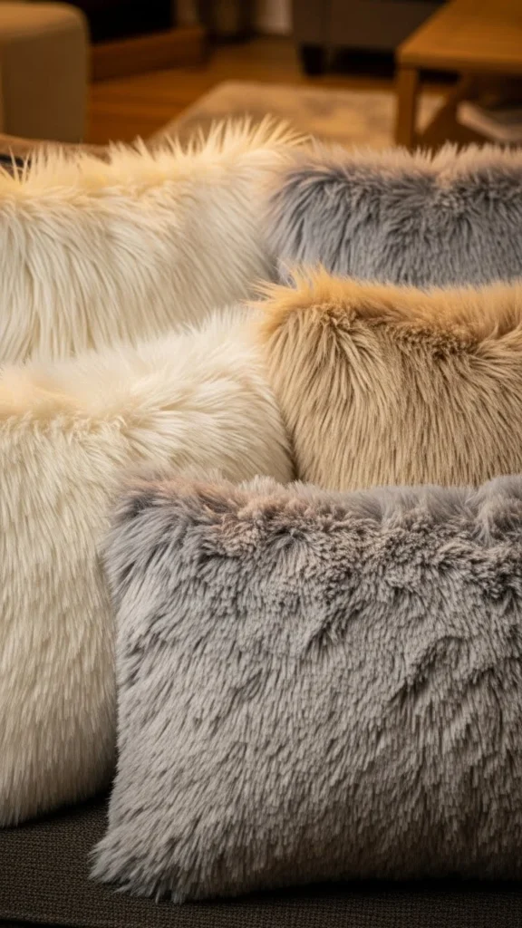 Faux fur pillows add instant comfort. Neutral colors keep them usable year-round.