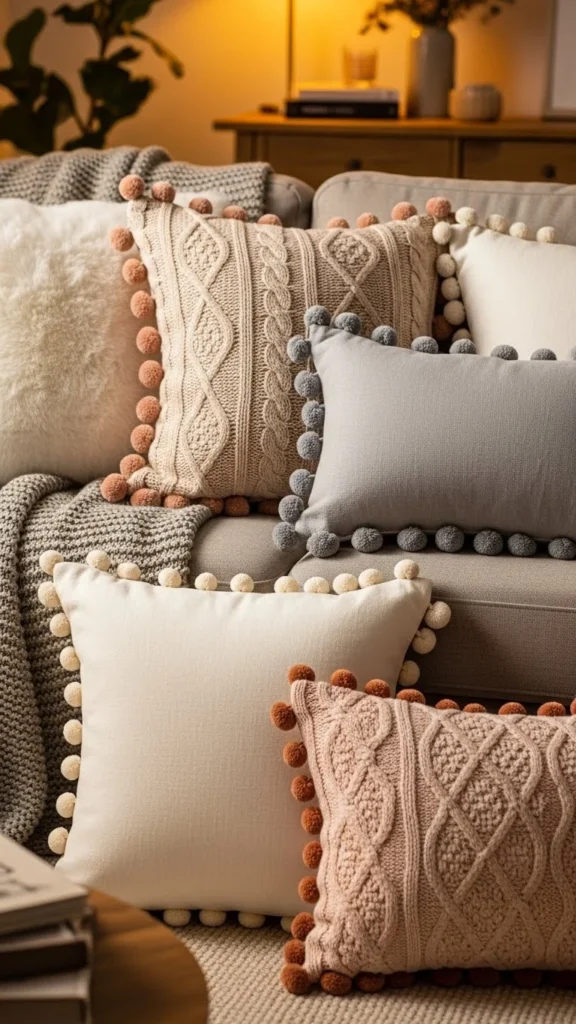 Pom-pom edge pillows add a lighthearted touch without feeling childish. The trim gives texture while the pillow itself can stay simple in color. This works especially well in family rooms or relaxed living spaces.
