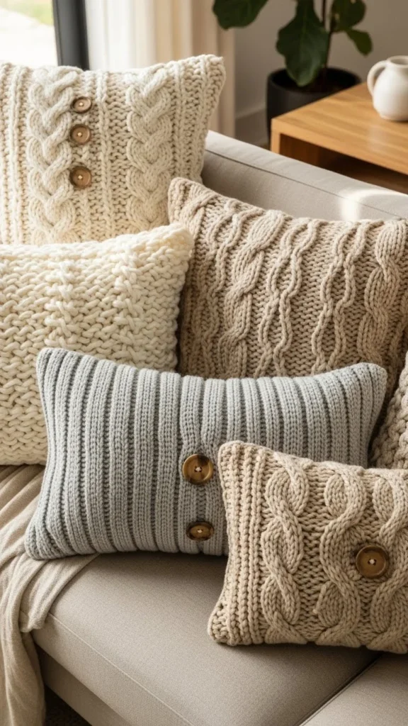 Knit throw pillows bring warmth through texture. Chunky stitches feel soft and inviting, especially during cooler months. Neutral knits work best for everyday living rooms.