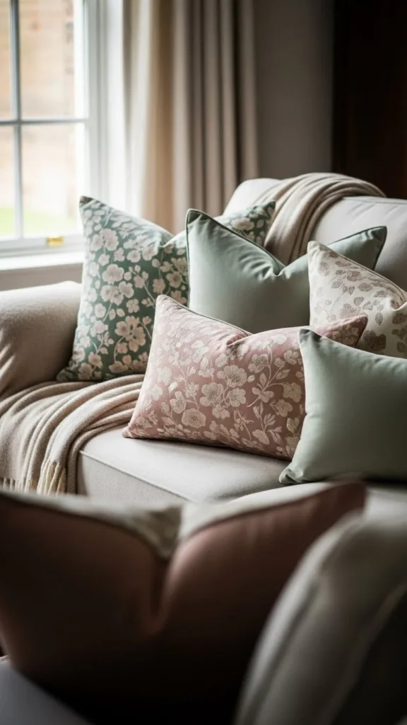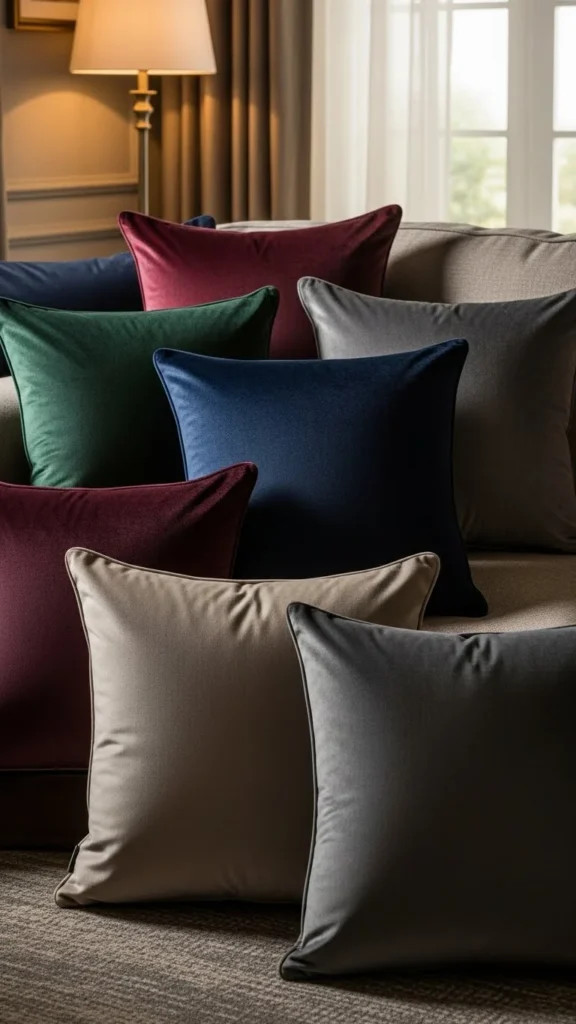 Velvet pillows add softness through texture and light reflection. Muted shades like dusty rose, olive, or navy feel cozy rather than flashy.