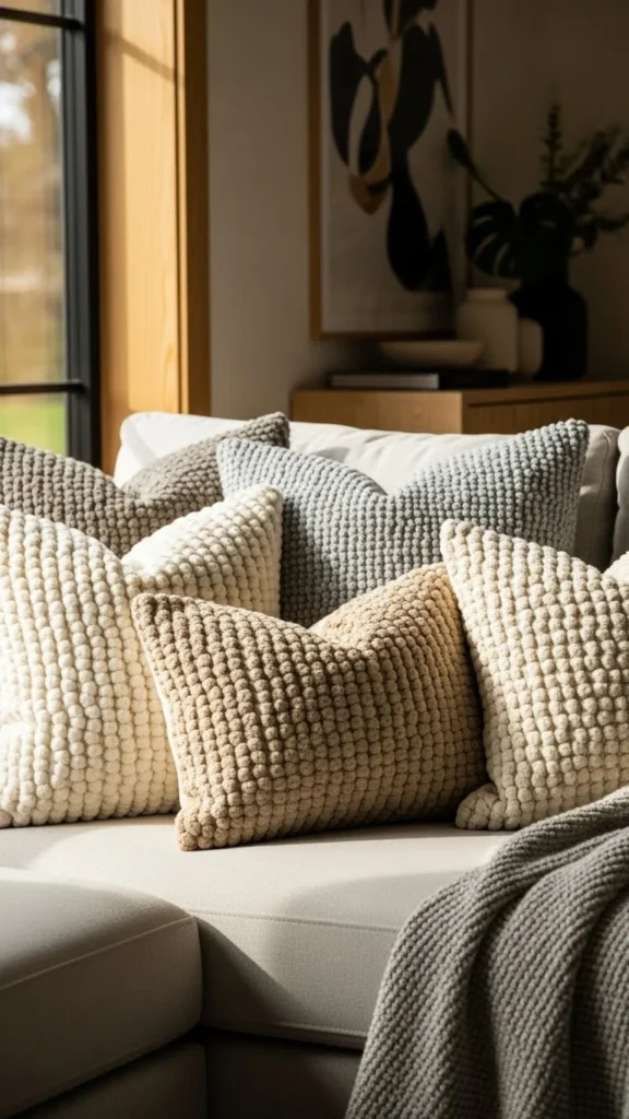 You don’t need many. One or two knit pillows mixed with smoother fabrics keep things interesting. Too many textured pieces can feel heavy, so spacing matters.