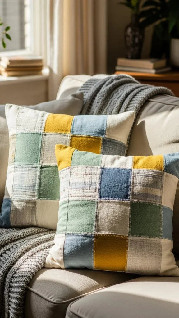 Patchwork pillows add personality and a collected feel. They work well in relaxed living rooms with layered textures.
