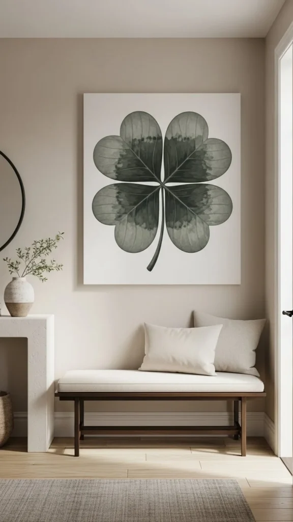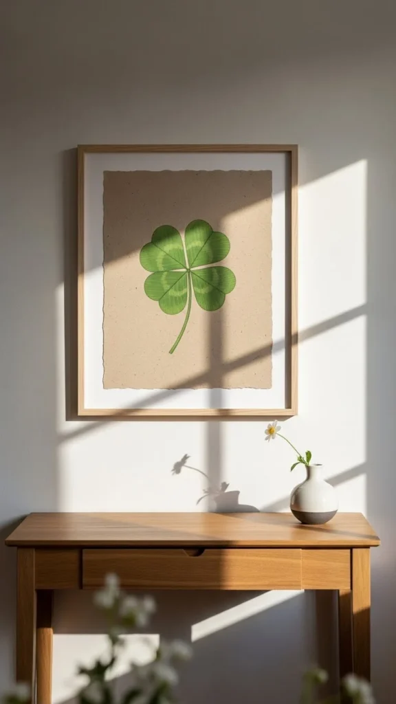 Framed clover prints are easy to style and widely available. Choose neutral mats so the green stands out without overpowering the wall. Thrift stores often carry botanical prints that work well here. Standard frame sizes help keep costs low. Group two or three together for balance, or hang a single print for a quieter look. This style fits living rooms, hallways, or home offices without demanding extra décor.