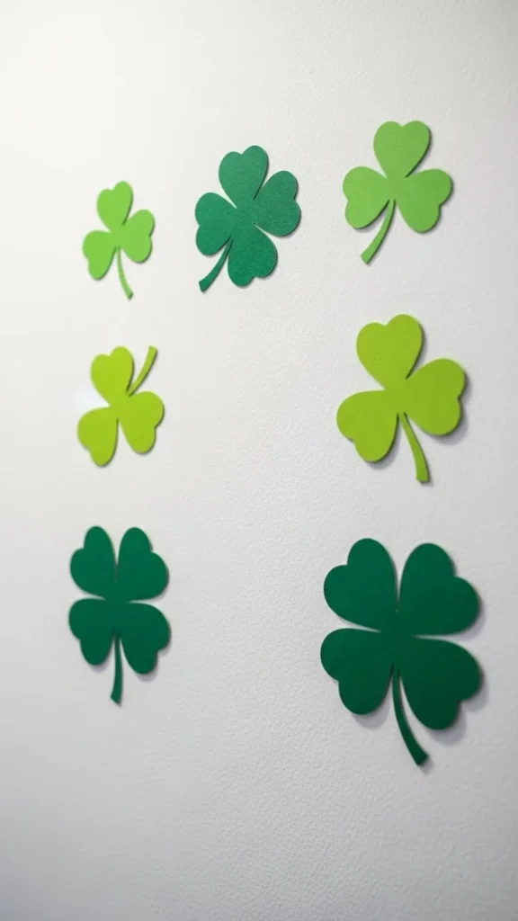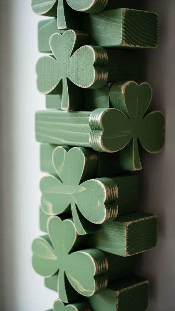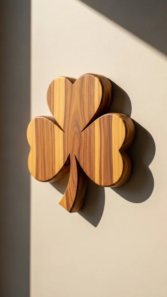 Wooden clover shapes add warmth. Craft stores sell unfinished cutouts that can stay natural or be lightly stained. Use removable hooks to avoid wall damage. These pieces work nicely in entryways or kitchens.