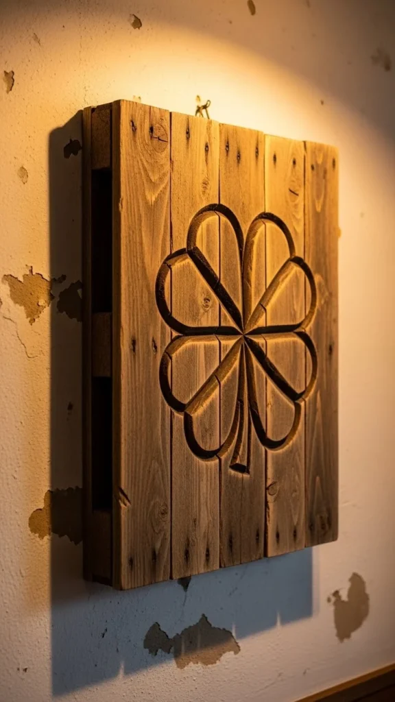 Pallet wood adds texture. Cut simple clover outlines. Sand edges lightly for safety.