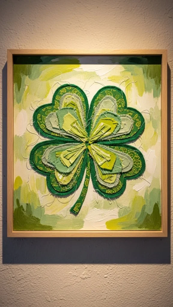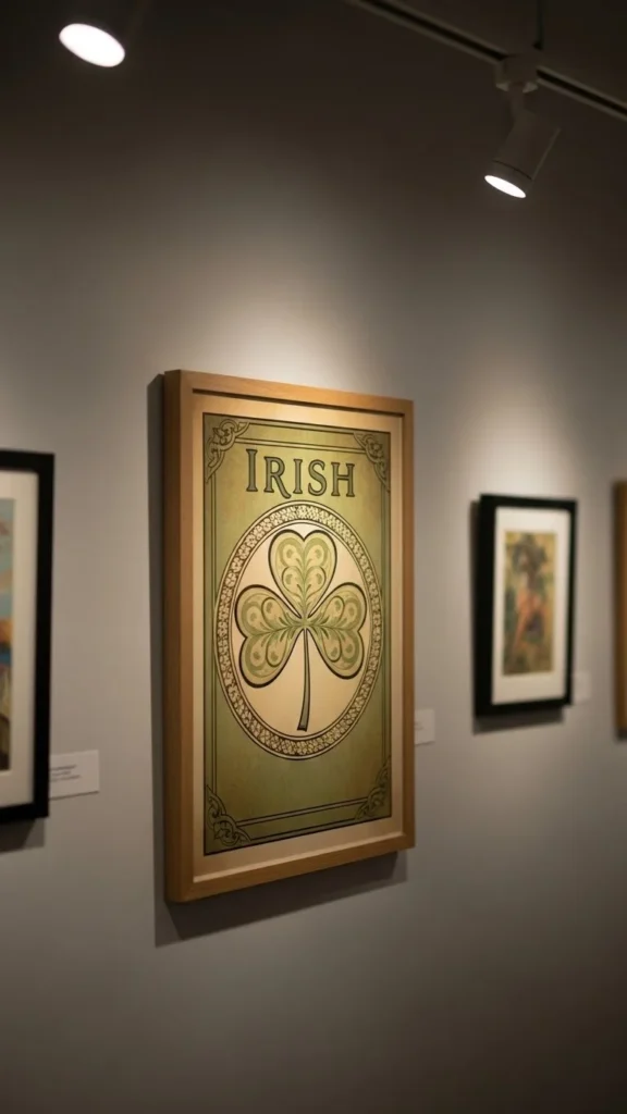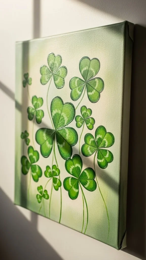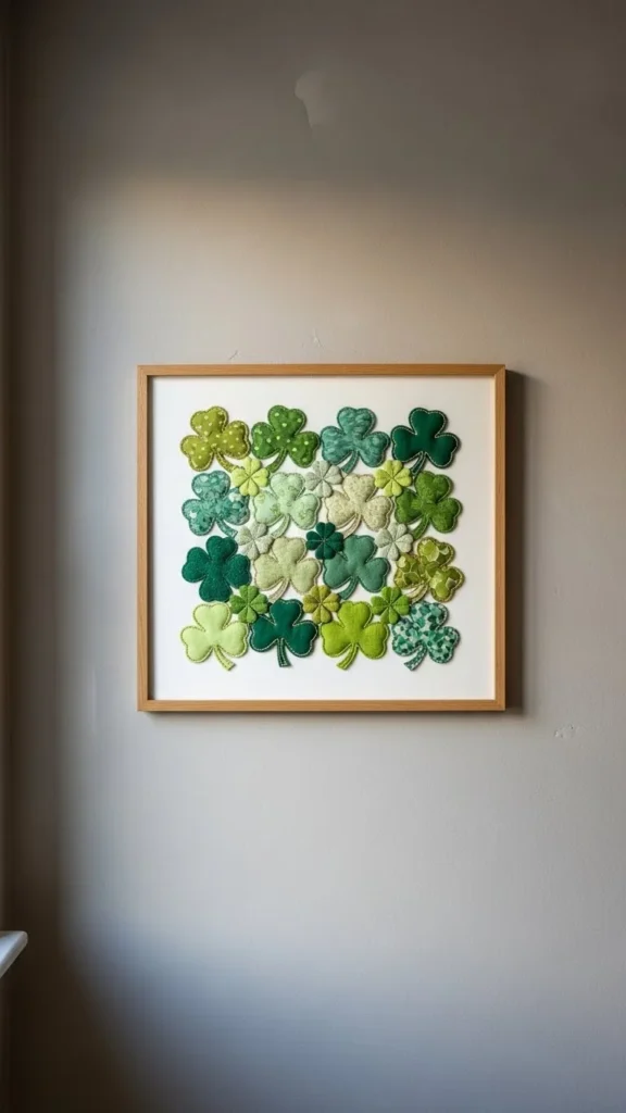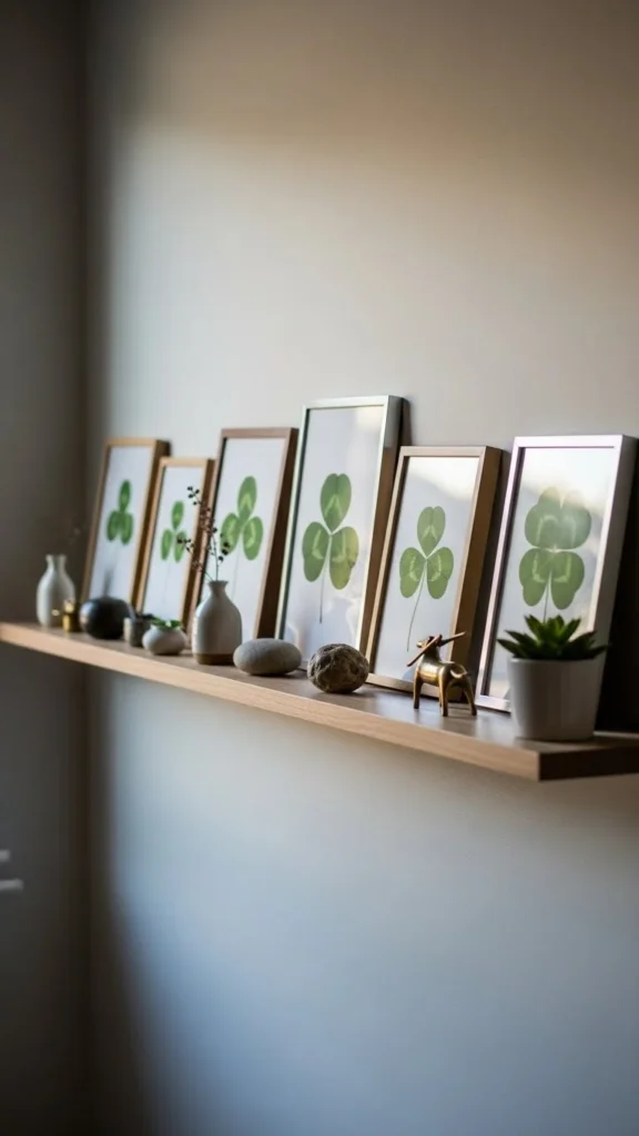 Mix clover pieces with photos or abstracts. This keeps the theme subtle. Use matching frames to unify the wall without extra spending.