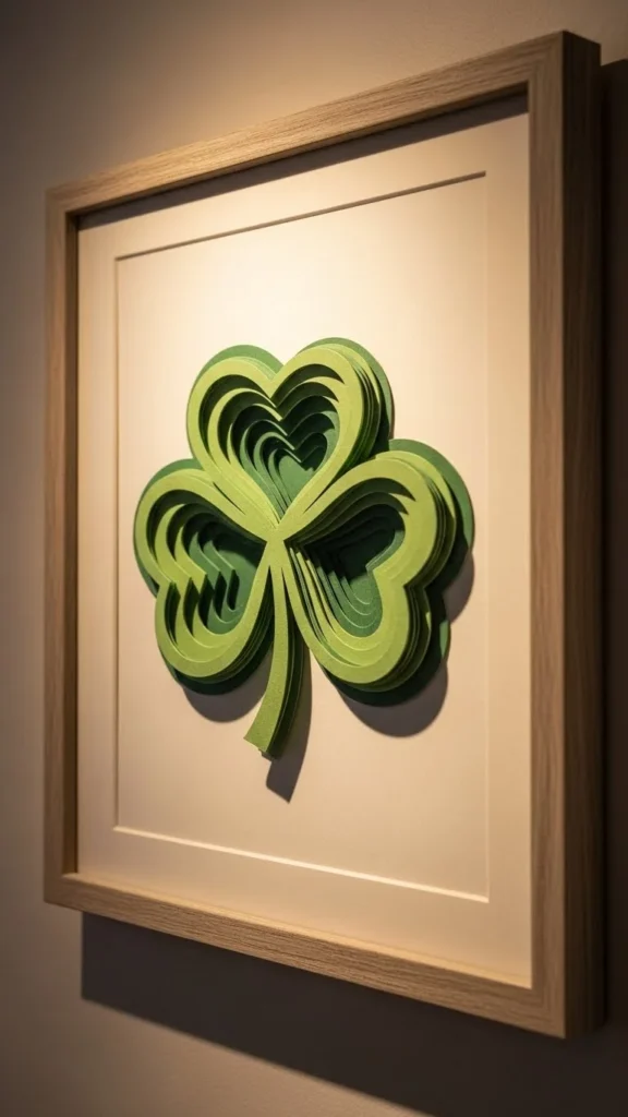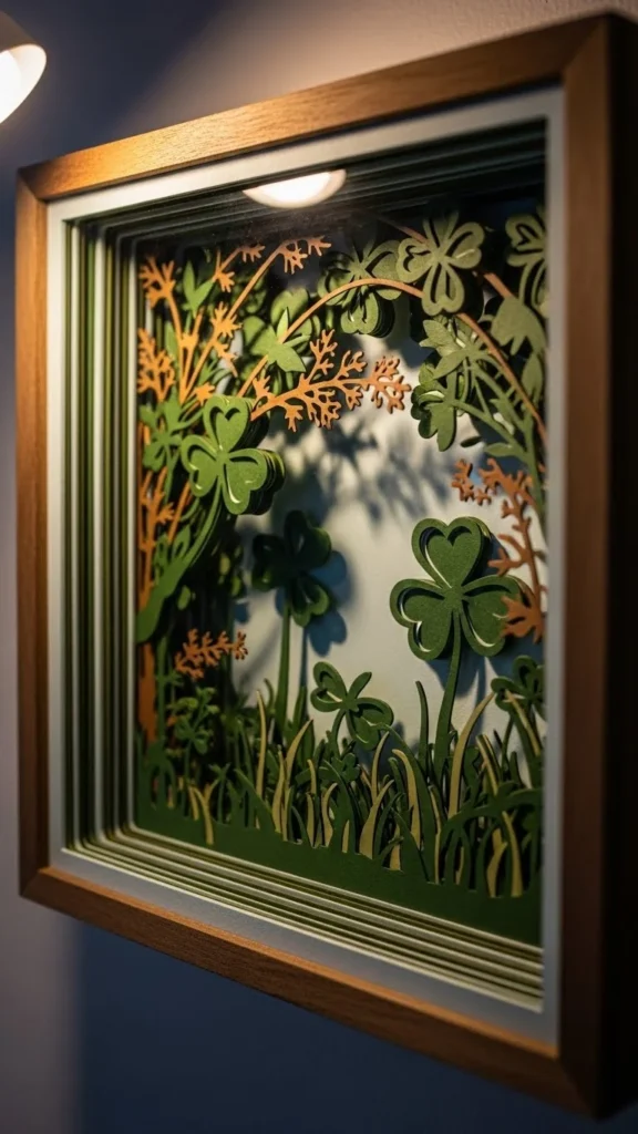 Shadow boxes add depth. Layer paper or small wooden clovers inside. Thrifted shadow boxes reduce cost. Keep colors limited for a clean look.