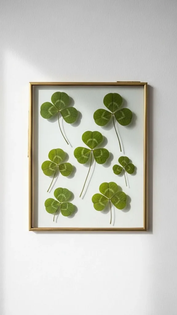 Pressed clovers offer a handmade feel. You can press real clovers between books, then mount them on plain paper. Float frames keep the focus on the plant shape. This idea works well for renters since frames are lightweight. It also makes a thoughtful seasonal update without buying new décor each year.