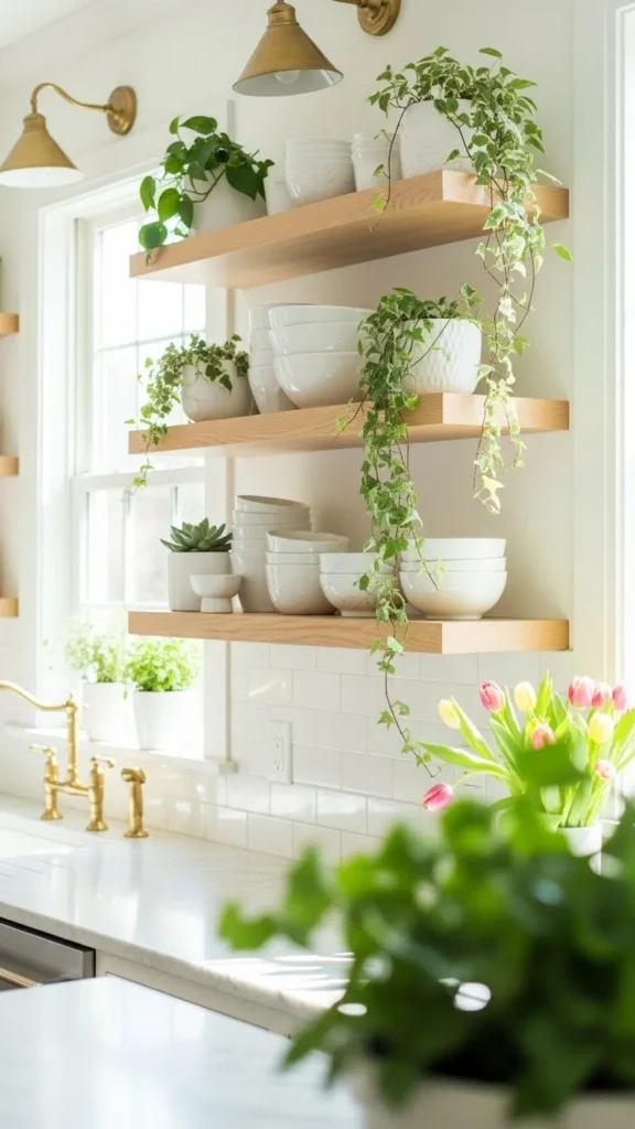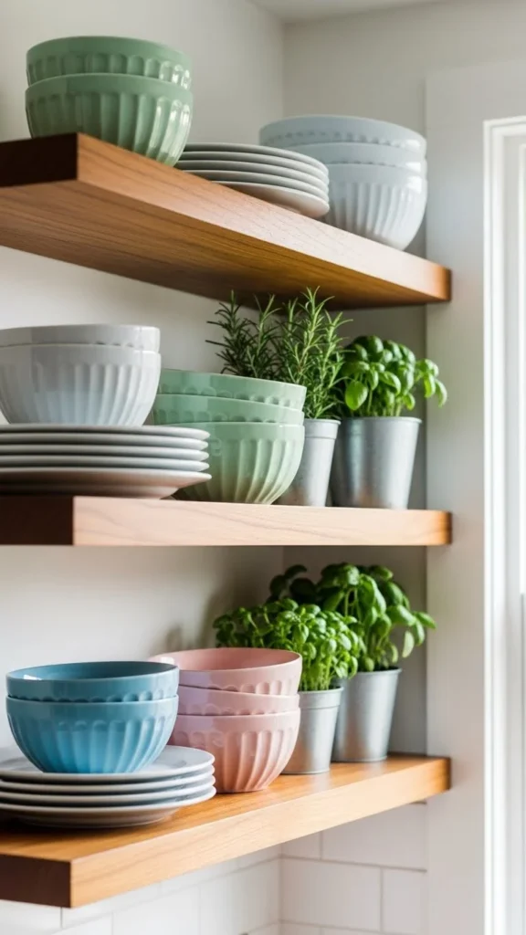 [Image Prompt: A spring kitchen with open shelves styled using pastel ceramic bowls, simple white plates, small potted herbs, and warm wood accents under soft daylight, high-end DSLR realism, no text.]