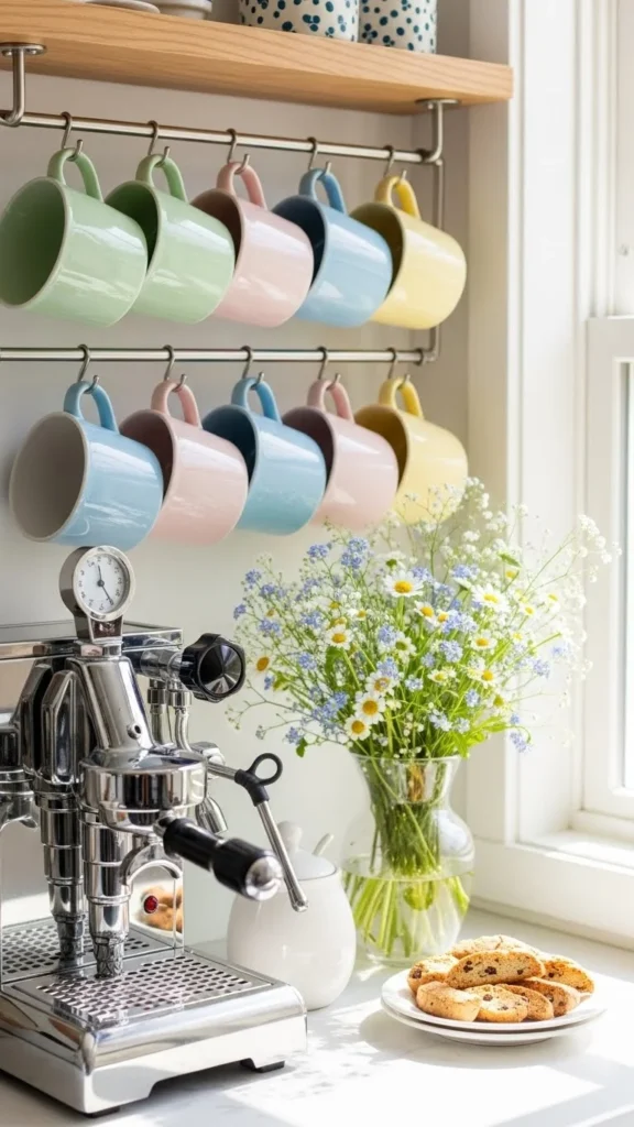 Wall hooks save counter space and show off colorful mugs. Add a small vase with flowers to soften the area.