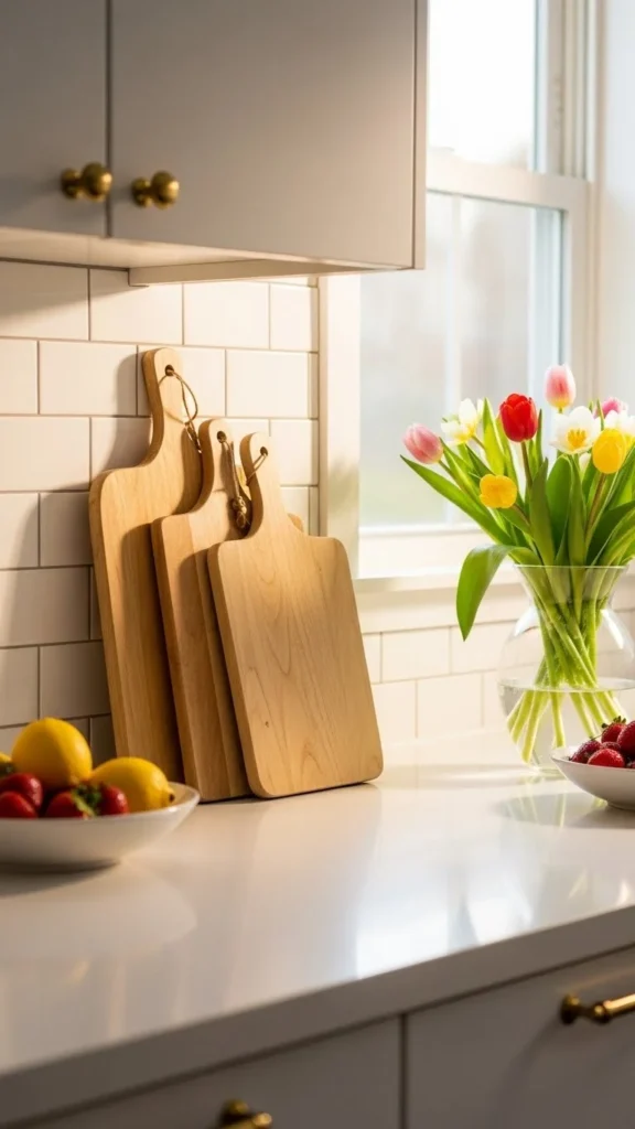 Cutting boards don’t have to stay hidden. Light wood boards leaned against the backsplash add warmth and texture.
