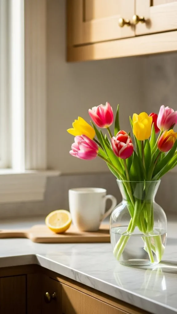 A single vase of flowers can lift the mood of the whole kitchen. Tulips, daisies, or greenery work well.