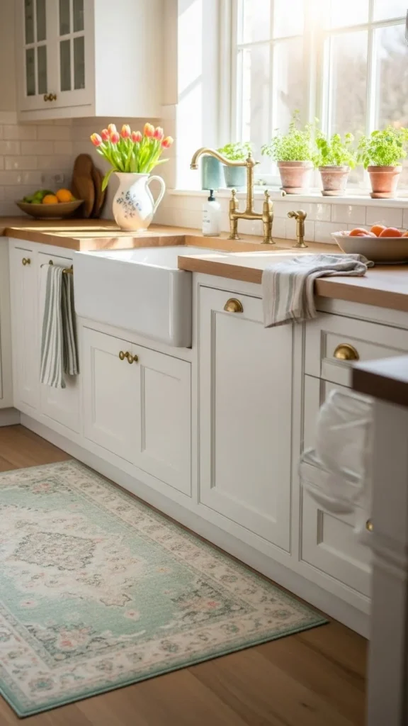 Place the rug where you stand often, like near the sink. That practical placement makes it feel purposeful.