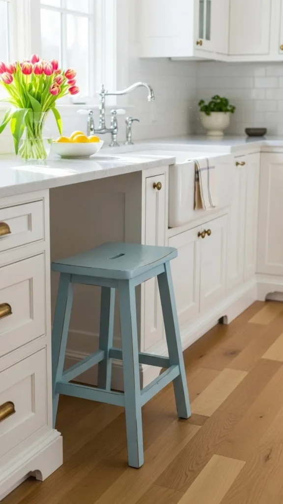 A painted stool adds color without taking much space. Soft shades suit spring kitchens well.