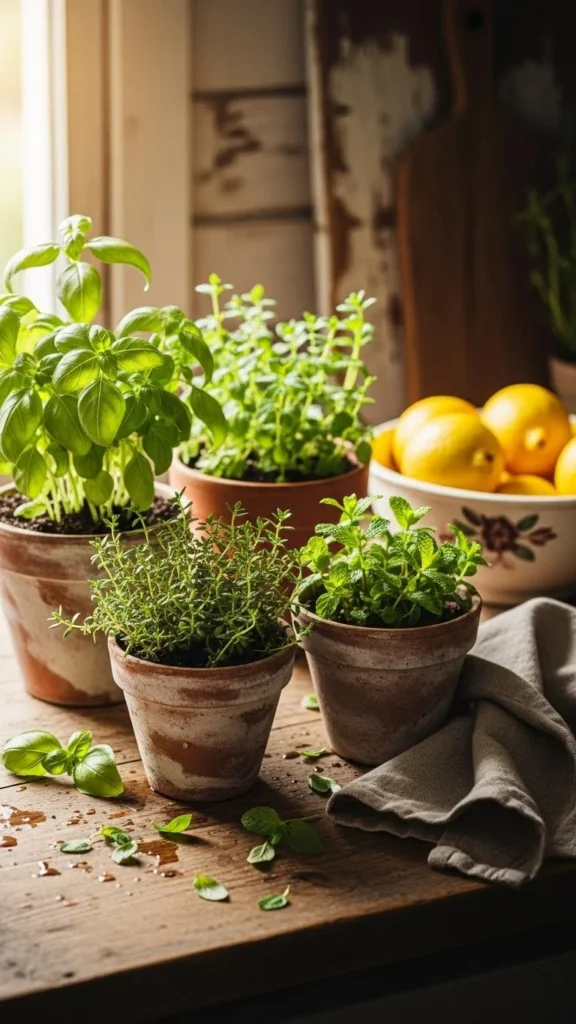 Herbs add life to a kitchen while staying practical. A few small pots on the counter bring color and scent without crowding the space. Basil, mint, and thyme are easy to care for and grow well indoors.
