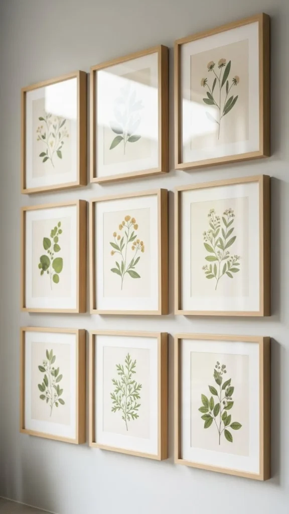 Botanical prints bring nature indoors in a calm, understated way. Choose illustrations of herbs, flowers, or leaves in soft tones. Avoid overly detailed or dark prints that feel heavy.