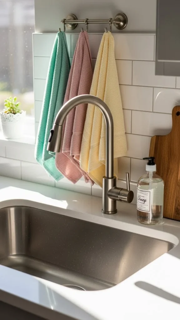 Dish towels are everyday items, so letting them double as decor makes sense. Pastel towels brighten the kitchen while staying useful.
