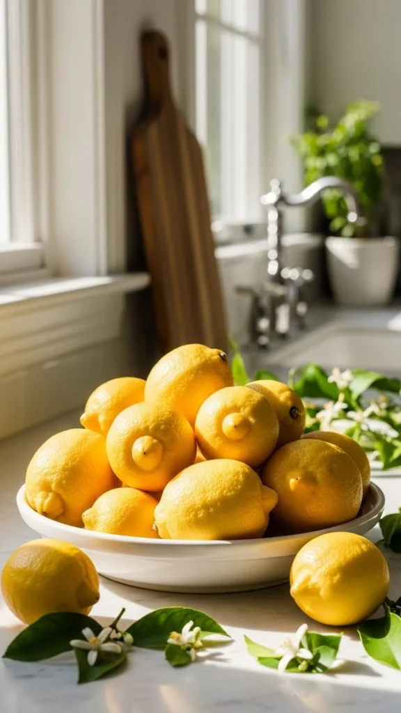 Citrus fruit adds instant color and warmth. A simple bowl of lemons or oranges makes the kitchen feel lively and inviting.