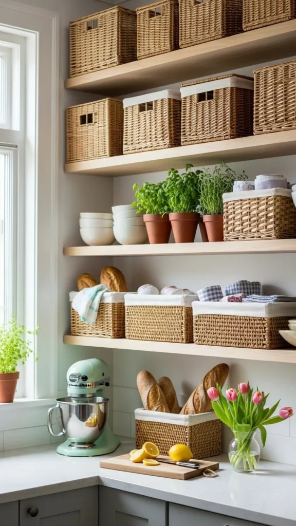 Wicker baskets bring warmth and texture to kitchens filled with hard surfaces. They work well on open shelves or above cabinets.