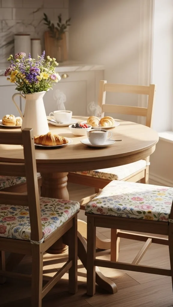 Chair cushions add comfort and style in one step. Floral patterns bring a gentle spring feel to breakfast nooks and small dining areas.