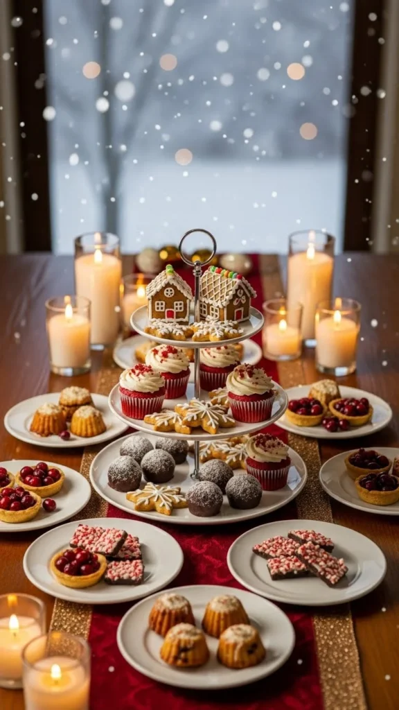 Use candlelight, cake stands, and simple greenery.