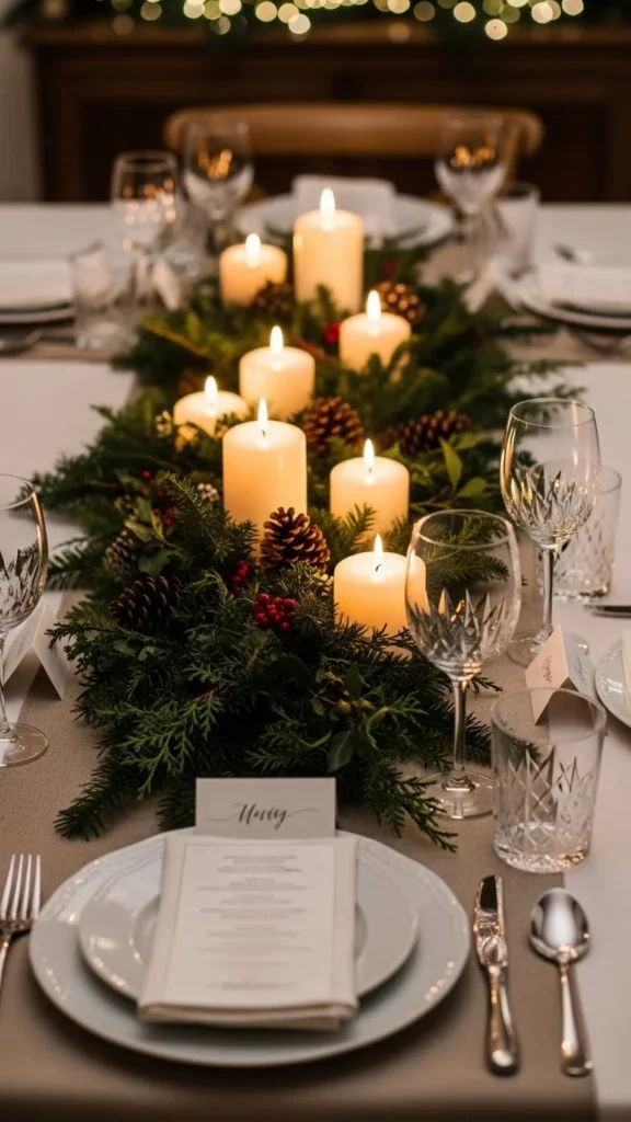 Lay a narrow strip of greenery down the middle of the table. Pine, cedar, or eucalyptus all work.