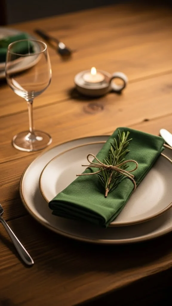 Fold cloth napkins simply. Add a rosemary or pine sprig tied with twine.