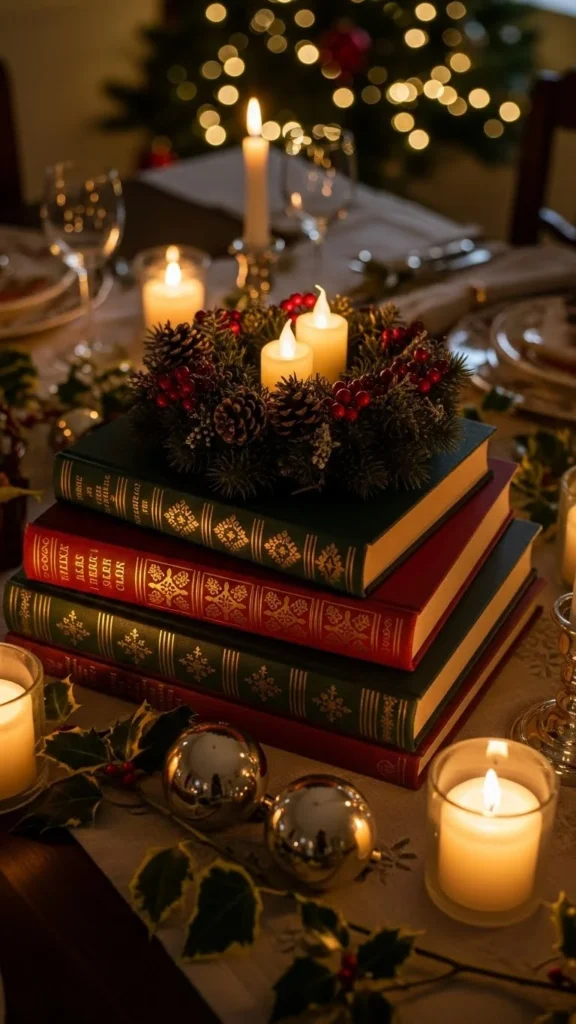 Stack two books at the center and place candles or greenery on top.