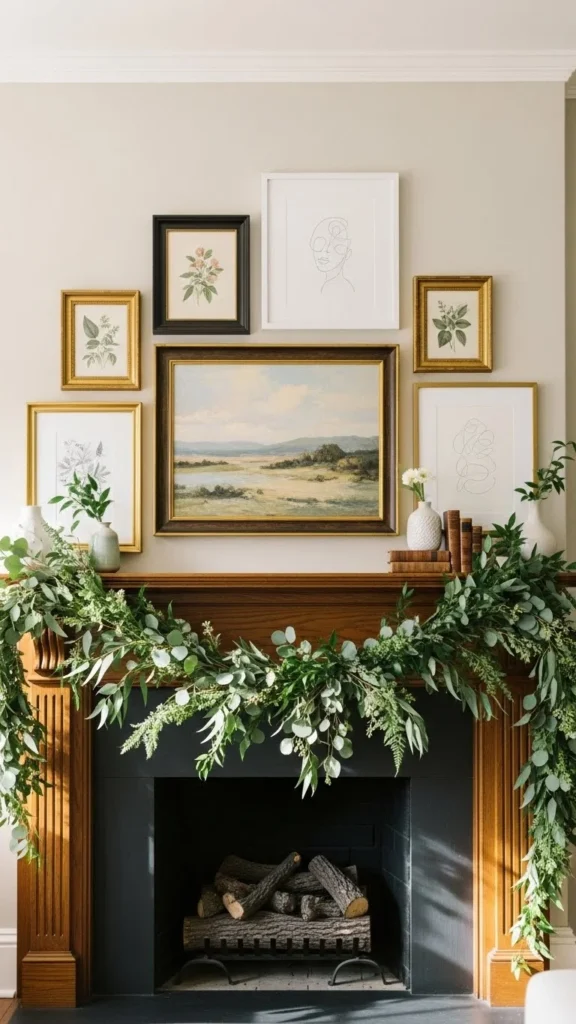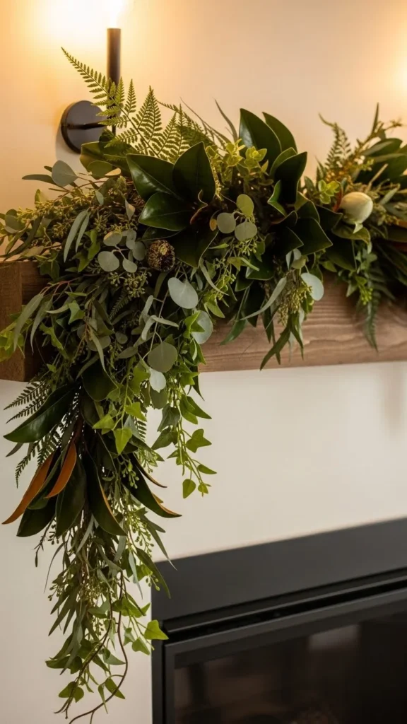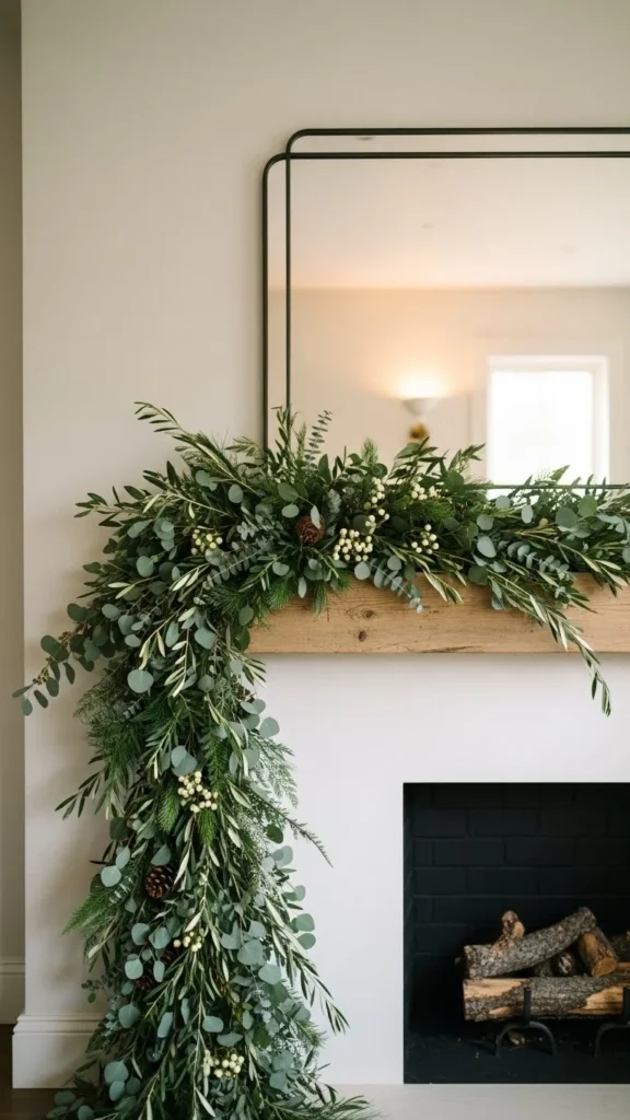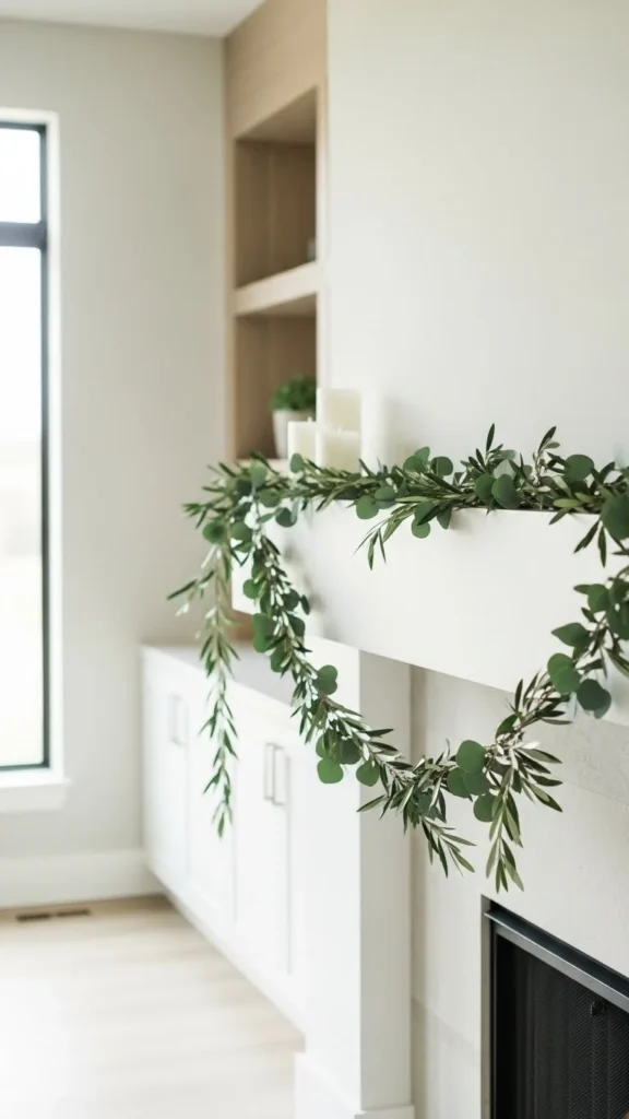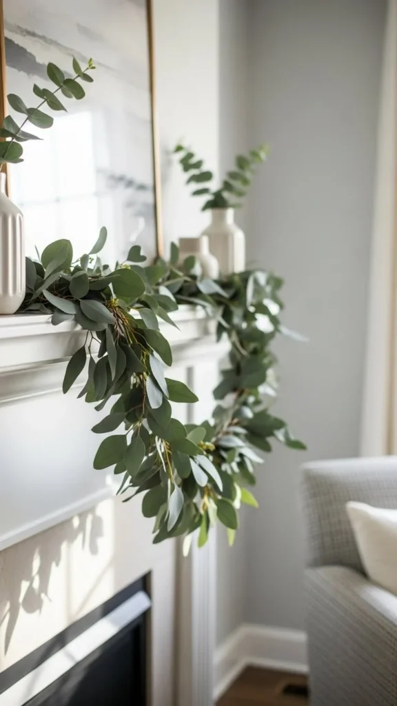 Eucalyptus garlands feel relaxed and work year-round. Faux versions last longer and stay flexible. Lay the garland in a loose curve rather than pulling it tight. This keeps it natural-looking. If the strand feels thin, double it up. Budget-friendly eucalyptus stems can be wired together in minutes. Keep the rest of the mantel simple with candles or framed art. This style pairs well with neutral walls and wood accents. If using real eucalyptus, trim the ends every few days and keep it away from heat.