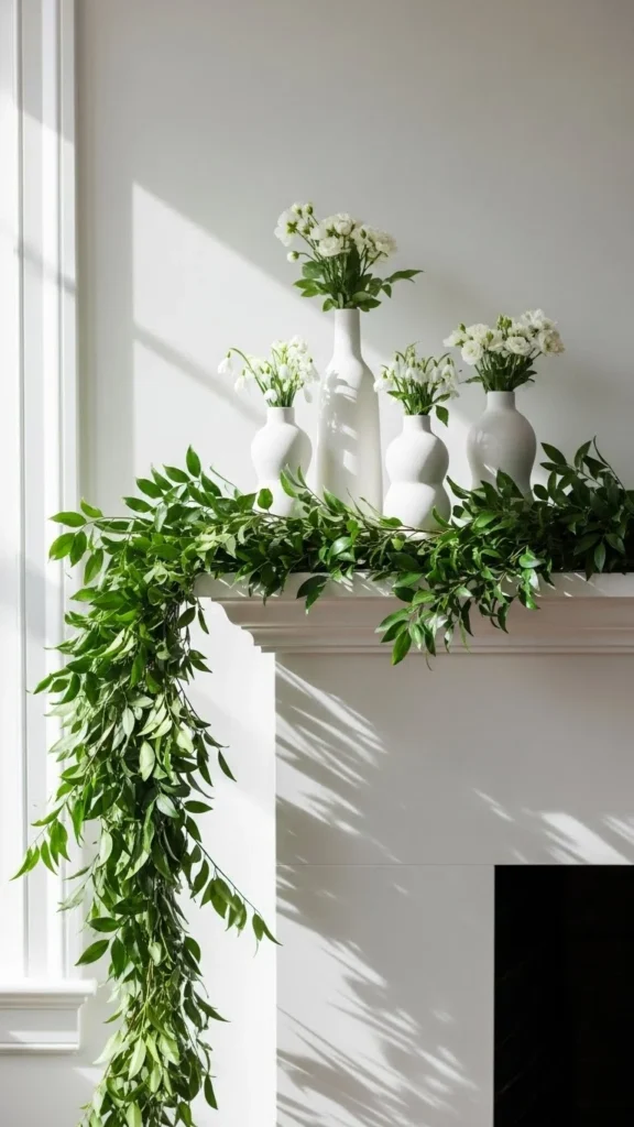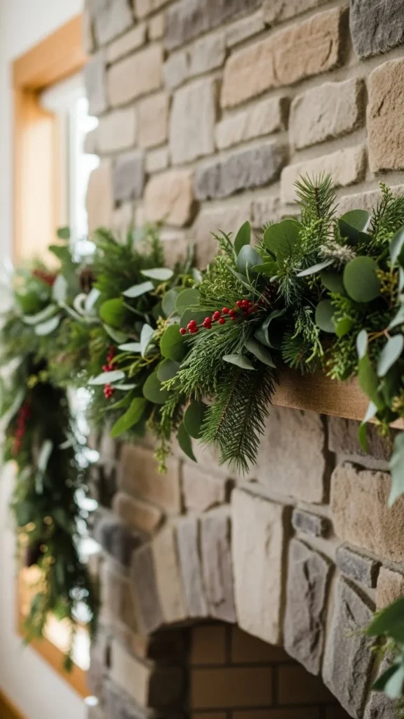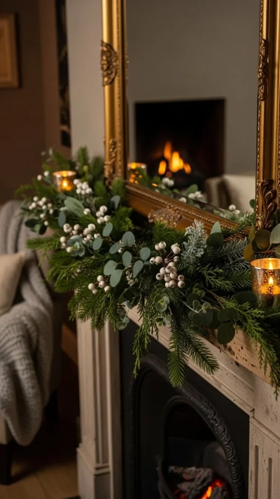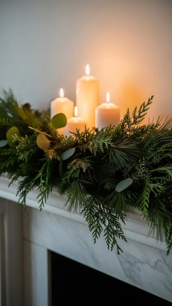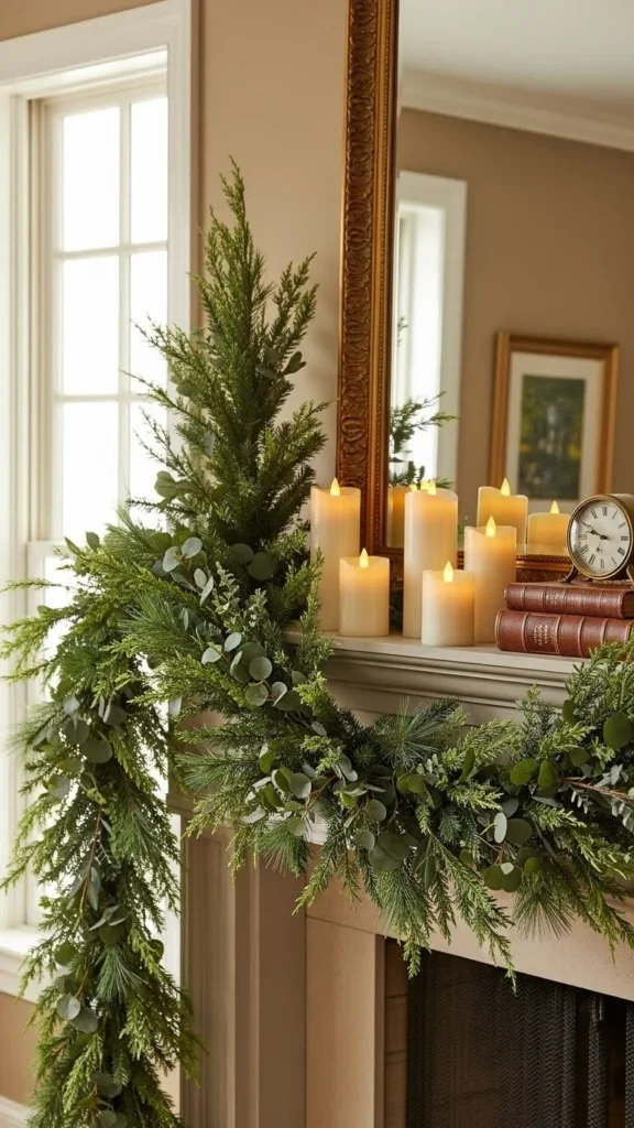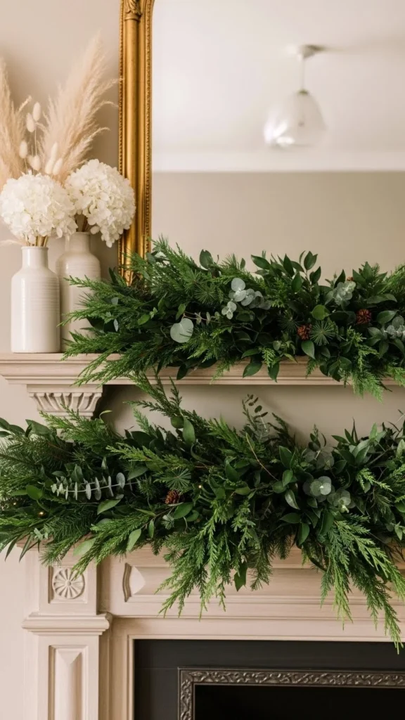 Eucalyptus garlands feel relaxed and work year-round. Faux versions last longer and stay flexible. Lay the garland in a loose curve rather than pulling it tight. This keeps it natural-looking. If the strand feels thin, double it up. Budget-friendly eucalyptus stems can be wired together in minutes. Keep the rest of the mantel simple with candles or framed art. This style pairs well with neutral walls and wood accents. If using real eucalyptus, trim the ends every few days and keep it away from heat.