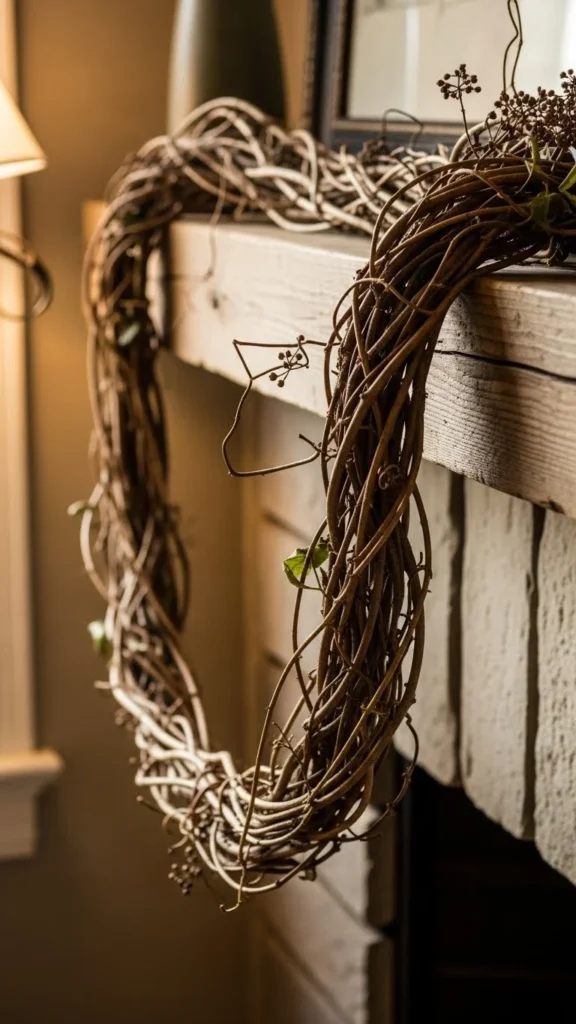 Asymmetry makes a mantel feel casual. Anchor one end with a hook and let the other fall naturally. This style works well with tall vases or stacked books.