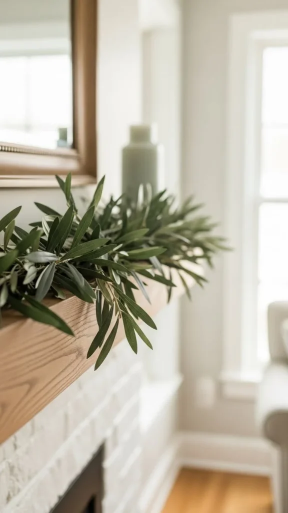 Olive branches bring a calm, lived-in feel. Faux olive garlands are lightweight and easy to shape. Drape them slightly off-center for interest. Pair with pottery or simple candlesticks. If cost is a concern, buy olive stems and wire them together. This garland suits modern and Mediterranean-inspired spaces.