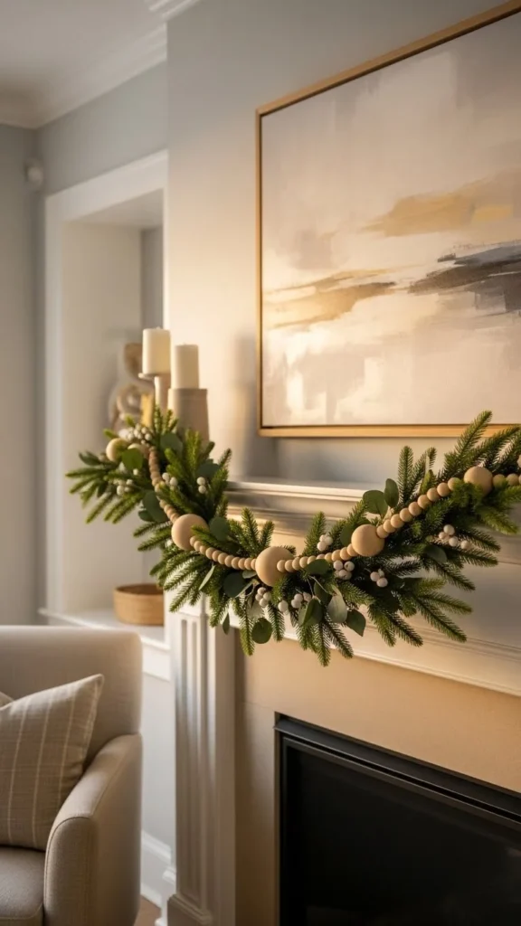 Wooden beads add warmth. Thread them onto twine and layer over greenery. This keeps costs low and adds texture. The look pairs well with farmhouse decor.