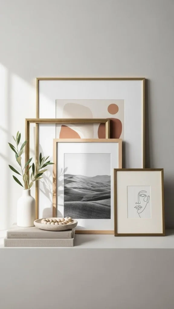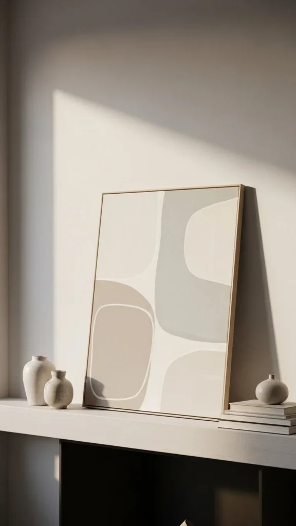Abstract art adds interest without themes. Lean it instead of hanging. Keep colors soft. Pair with simple decor to avoid distraction.