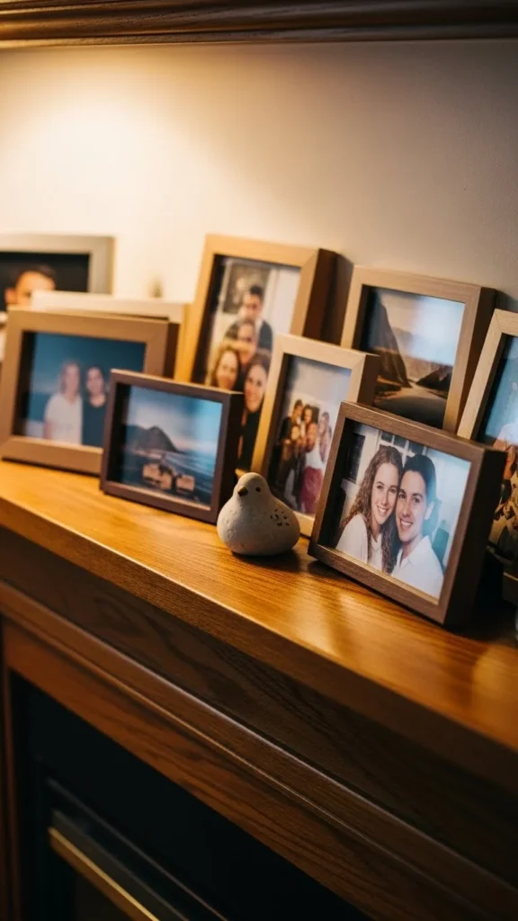 Photos make a space feel lived-in. Use small frames to keep things subtle. Stick to one frame style for order. Lean frames rather than hanging. This avoids wall damage and makes swapping easy. Limit the number so photos feel special.
