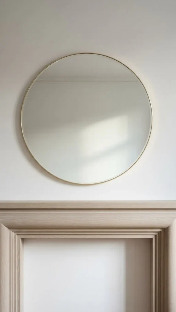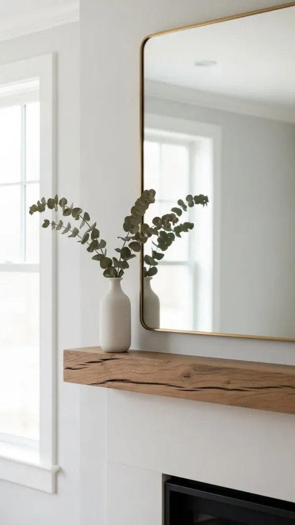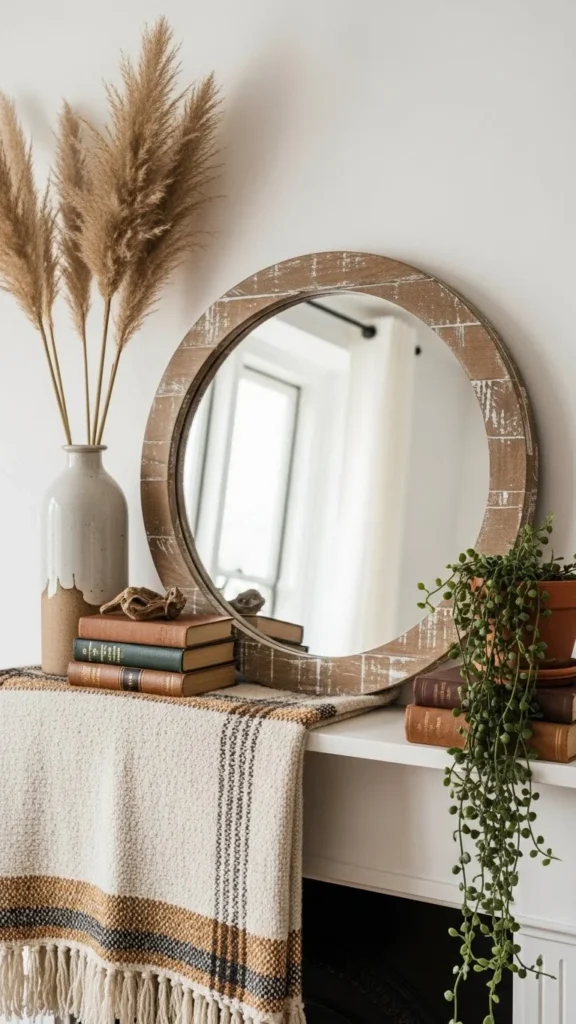 One mirror can anchor the entire mantel. Round shapes soften straight fireplace lines. Thrift stores often have mirrors that can be reused with a simple paint update. Place the mirror centered or slightly off-center for a relaxed feel. Keep decor underneath low so the mirror stands out. A pair of small objects on either side is enough. Mirrors help light bounce around the room and make the space feel open. If hanging feels tricky, rest the mirror directly on the mantel using rubber pads to stop slipping.