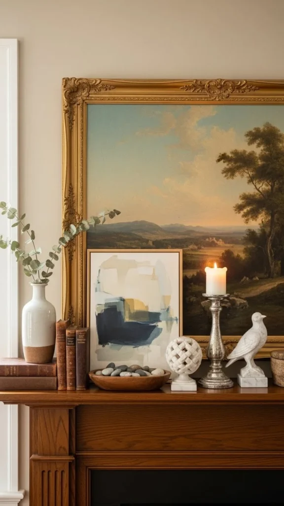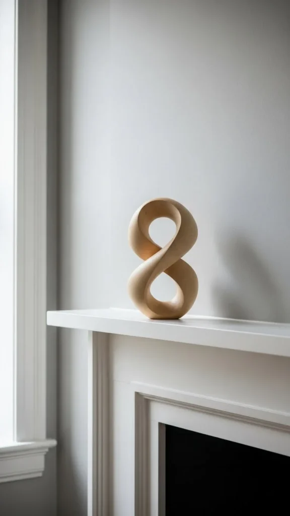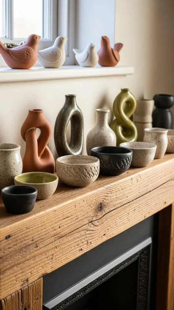 One sculptural piece can carry the entire mantel. Look for shapes rather than patterns. Thrifted pottery or wood pieces work well. Place it slightly off-center. Leave space around it. Empty space helps the piece stand out. This idea suits small rooms where clutter shows quickly.