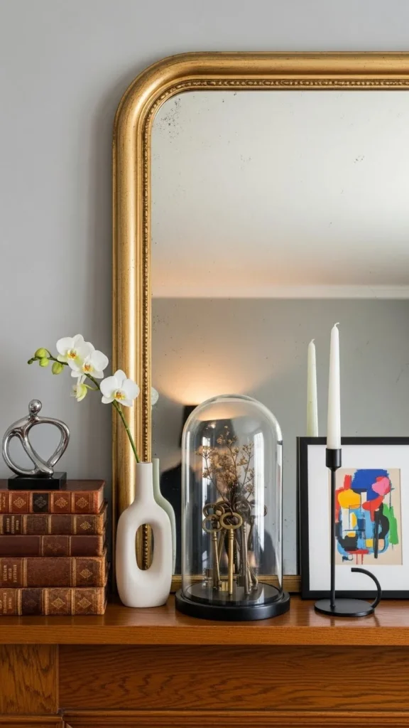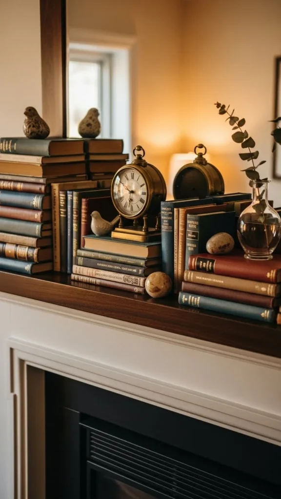 Books add character and height. Stack them horizontally to create small platforms for decor. Use neutral covers or turn books spine-in for a calmer look. Old books from shelves or thrift stores work well. Place one small object on top of each stack. Avoid piling too many items. Two stacks are usually enough. This idea works well for narrow mantels where space feels limited.