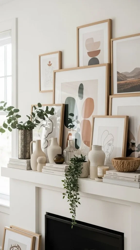 Leaning frames against the wall gives a relaxed look. You do not need matching frames. Mixing sizes and finishes works well. Use prints you already own or swap in free art downloads. Keep frames close together so they read as one group. This setup works well for renters since no nails are required. Add one small object in front, like a candle or vase, to add depth. If the mantel feels crowded, remove one frame. Editing makes a big difference. Store unused prints flat so you can rotate later. This approach lets you change the look often without spending money.