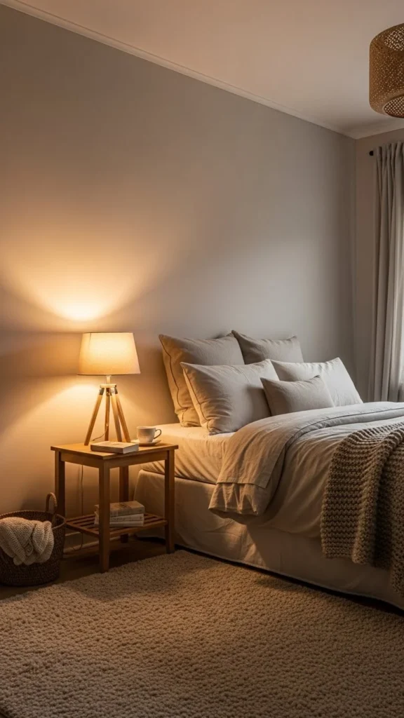 Table lamps or wall sconces work better than overhead lights for bedrooms.