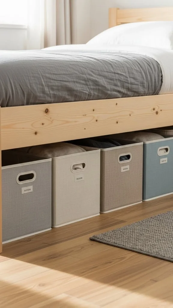 Clear surfaces help the room feel calmer. Under-bed bins or baskets work well.