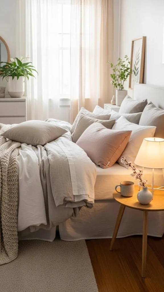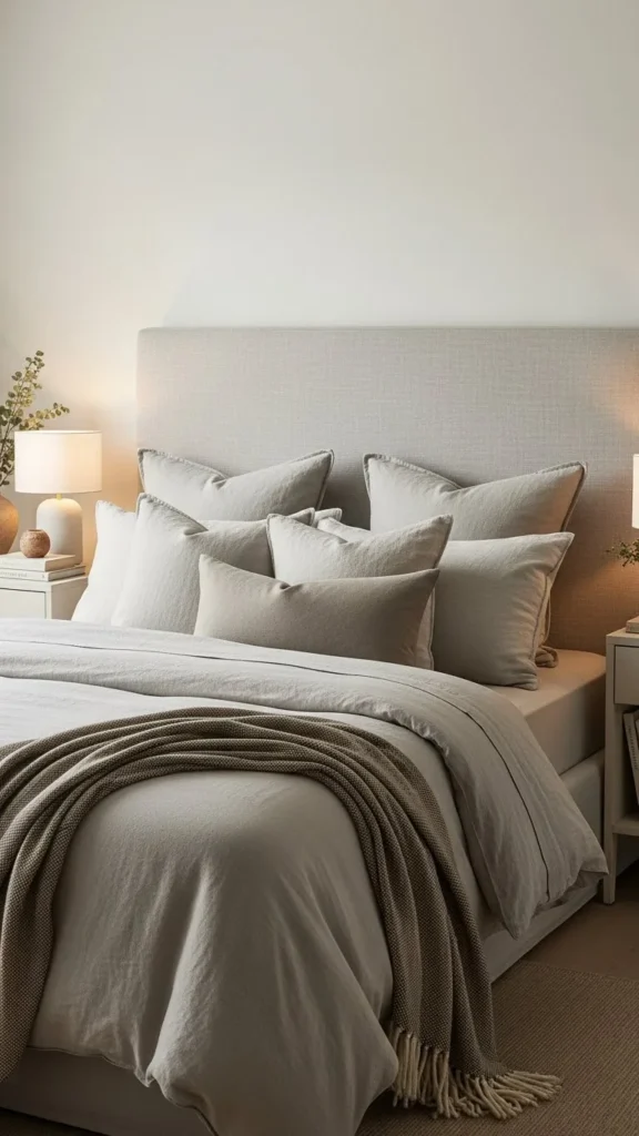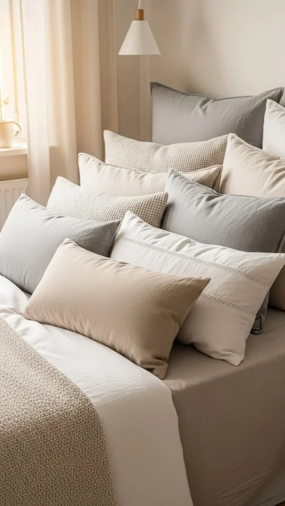 Too many pillows can feel annoying. Two or three layers are enough. Mix sizes instead of patterns.