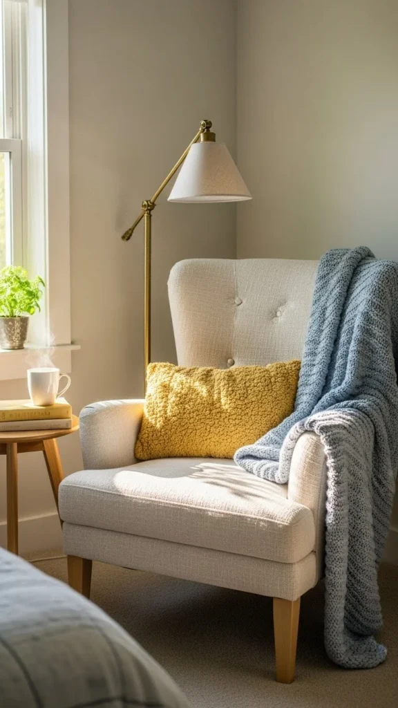 A chair and lamp create a calm corner. It does not need much space.