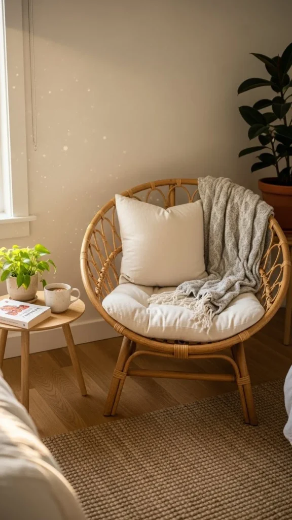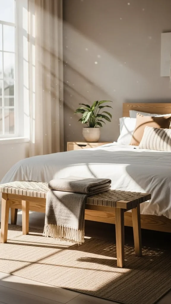 Wood, rattan, and woven pieces add warmth without making the space feel heavy. A small stool, tray, or basket can do the job.