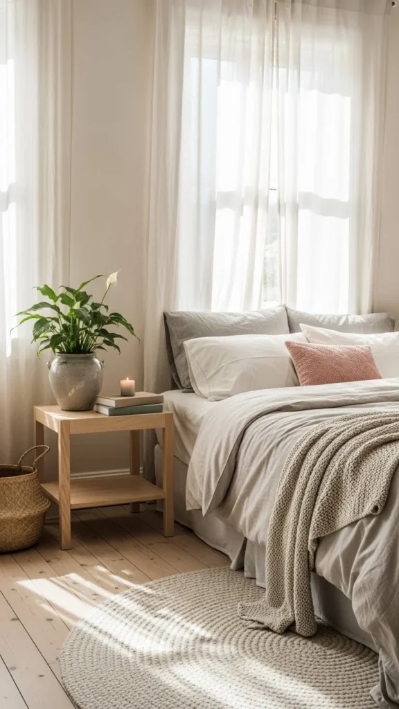 A light throw at the foot of the bed adds comfort without weight. Soft pastel shades like blush, sage, or pale blue work well for spring. They bring color without feeling loud.