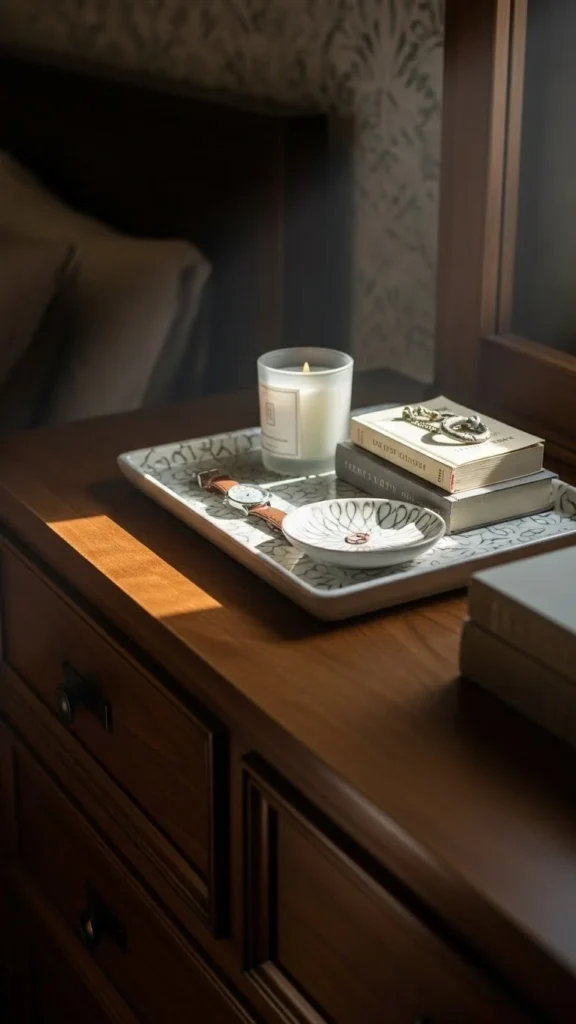 A tray keeps everyday items contained. Glasses, books, hand cream, or a candle feel intentional when grouped.
