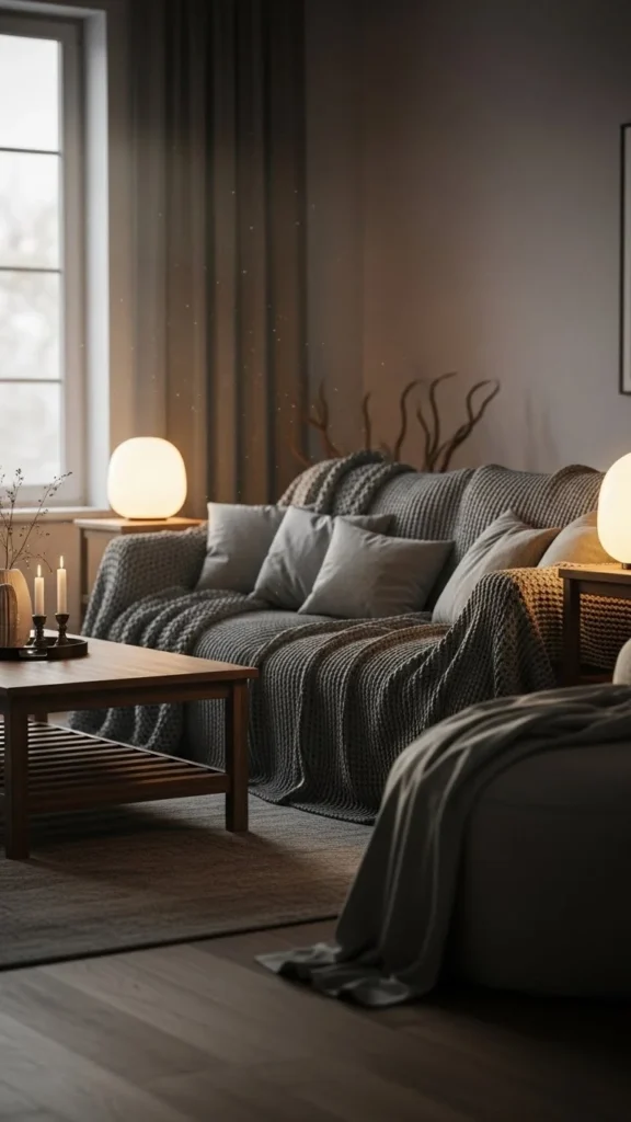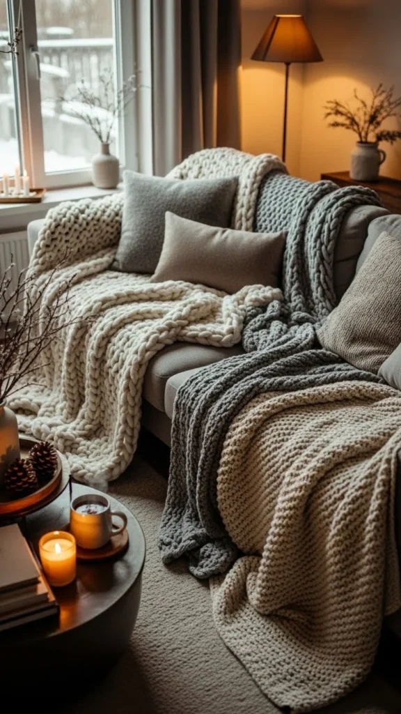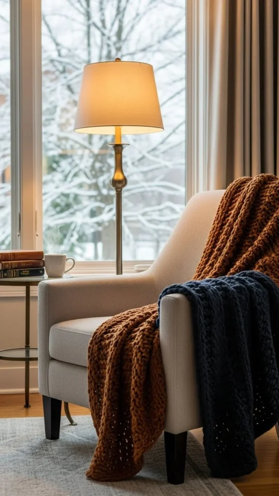 For a DIY option, hand-knit a small lap throw using thick yarn and basic stitches. No advanced skills required. Even uneven loops add charm. During colder nights, keep one within reach instead of storing it away. That daily use brings comfort and makes the room feel lived-in rather than styled for photos.