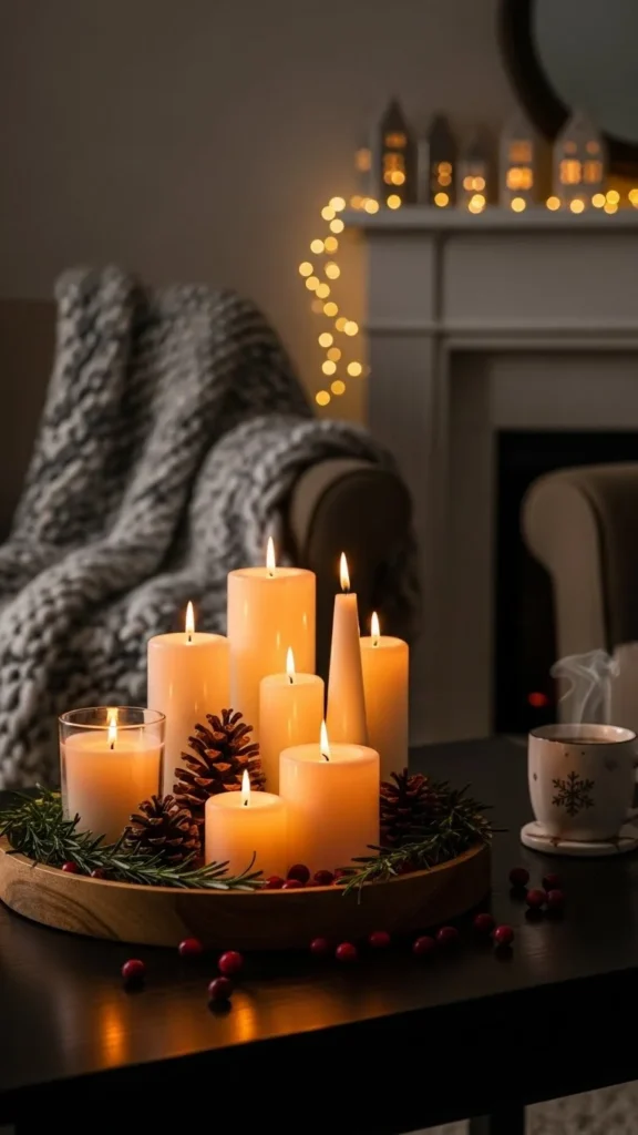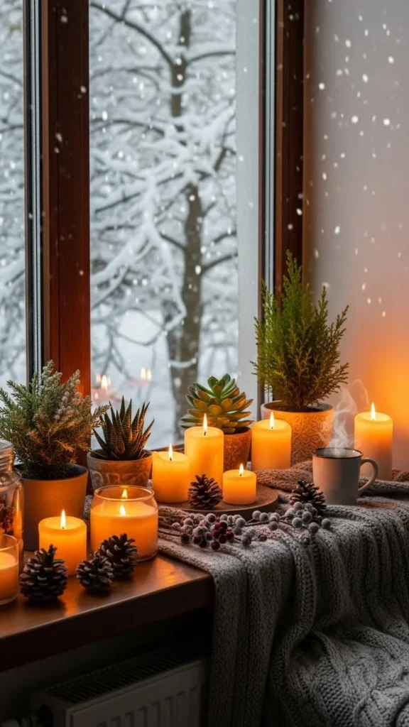 During winter evenings, candlelight near windows creates a soft glow from inside. Battery candles work well if open flames worry you.