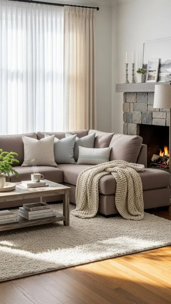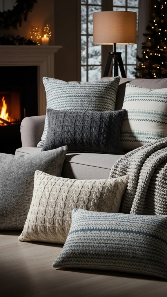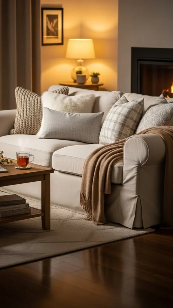 You don’t need many new cushions. Swap covers instead. Cushion covers cost less and store easily when seasons change. Neutral shades like taupe, cream, or soft brown work well during winter.